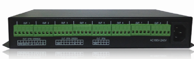 10、8端口输出,单口输出标准512通道,扩展协议带载点数由客户根据芯片特性自行测试,最大可支持1024像素点