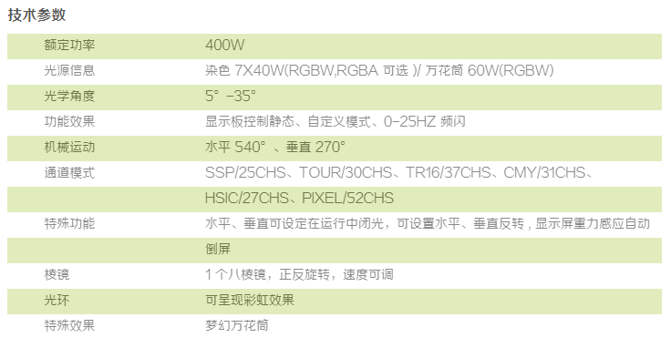 采用染色、万花筒和光环相结合的防水摇头铺光染色灯。灯头配置灯带效果,高效的光学设计,加入HSIC智能混色系统,快速调出想要的颜色,混色极度均匀。独立单点控制,绚丽效果极致呈现。拥有5-35°的快速电子变焦。灯体重量轻,结构紧凑。此款产品按照长期户外固定安装的防护要求设计,适用于专为户外演唱会、主题公园、游乐场所实景演出及租赁演出户外场所。