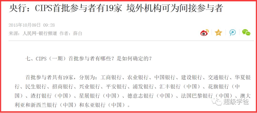2015年,中国自有的国际支付系统——人民币跨境支付系统(CIPS)上线运行,首批玩家有19家。2016年3月,俄罗斯外贸银行宣布加入。